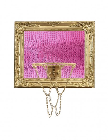 Mini aro amb taulell rosa, xarxa de cadena i acabat en pell sintètica tipus cocodril. Una peça decorativa amb caràcter per a qualsevol espai.