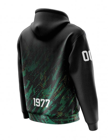 Dessuadora unisex confeccionada amb teixit de pelfa perxada a l'interior. Té una butxaca cangur al centre. La caputxa és folrada i té un cordó per ajustar-la (excepte les talles petites, que per seguretat dels infants no tenen cordó).