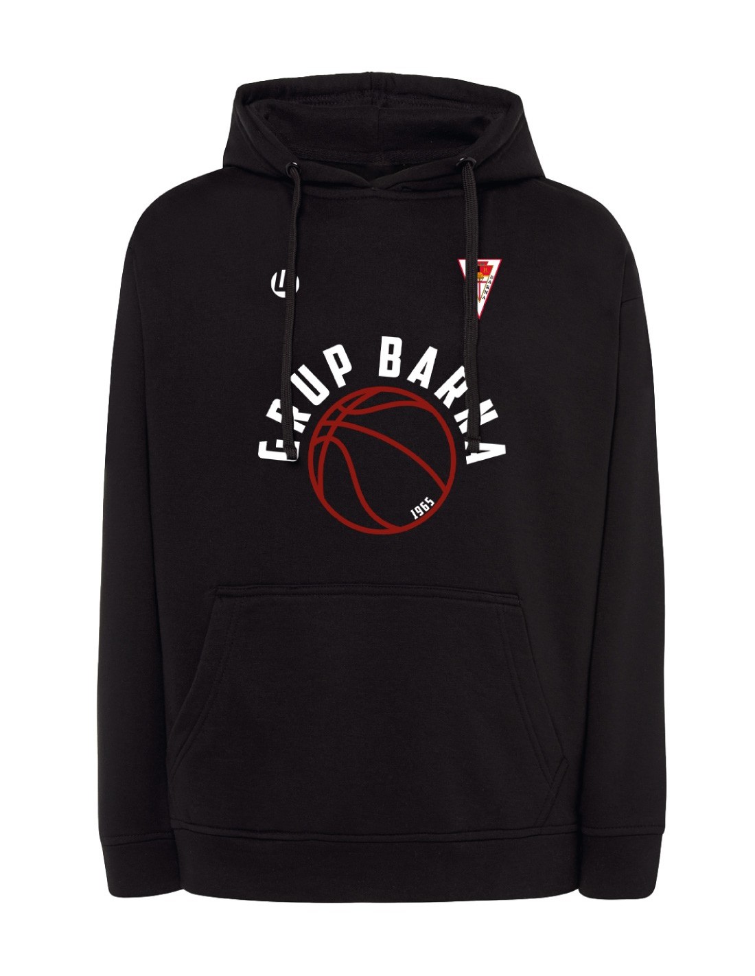 Hoodie with a kangaroo pocket. Its composition is 65% polyester and 35% cotton.