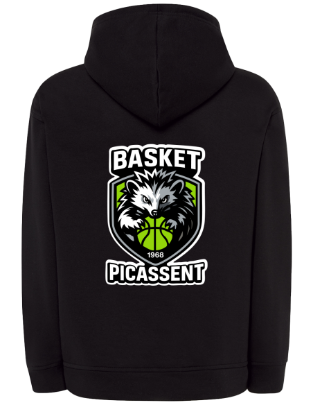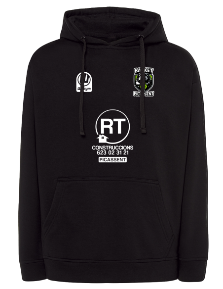Sudadera unisex confeccionada con tejido de pelfa perchada en el interior. Tiene un bolsillo canguro en el centro. La capucha está forrada y tiene un cordón para ajustarla (excepto las tallas pequeñas para niños, que por seguridad no tienen cordón).